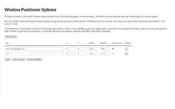 With Window Positioner, you can specify the pages you want to open in new windows upon Chrome startup. The add-on also gives you the ability to set the width, height, and position of each window in pixels. Additionally, you have the option to start a window in "full screen" mode.